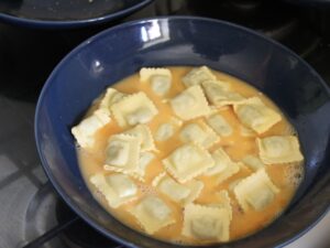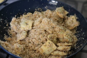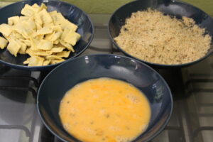 - Place your fresh ravioli into the egg first and then into the breadcrumbs bowl until well coated.