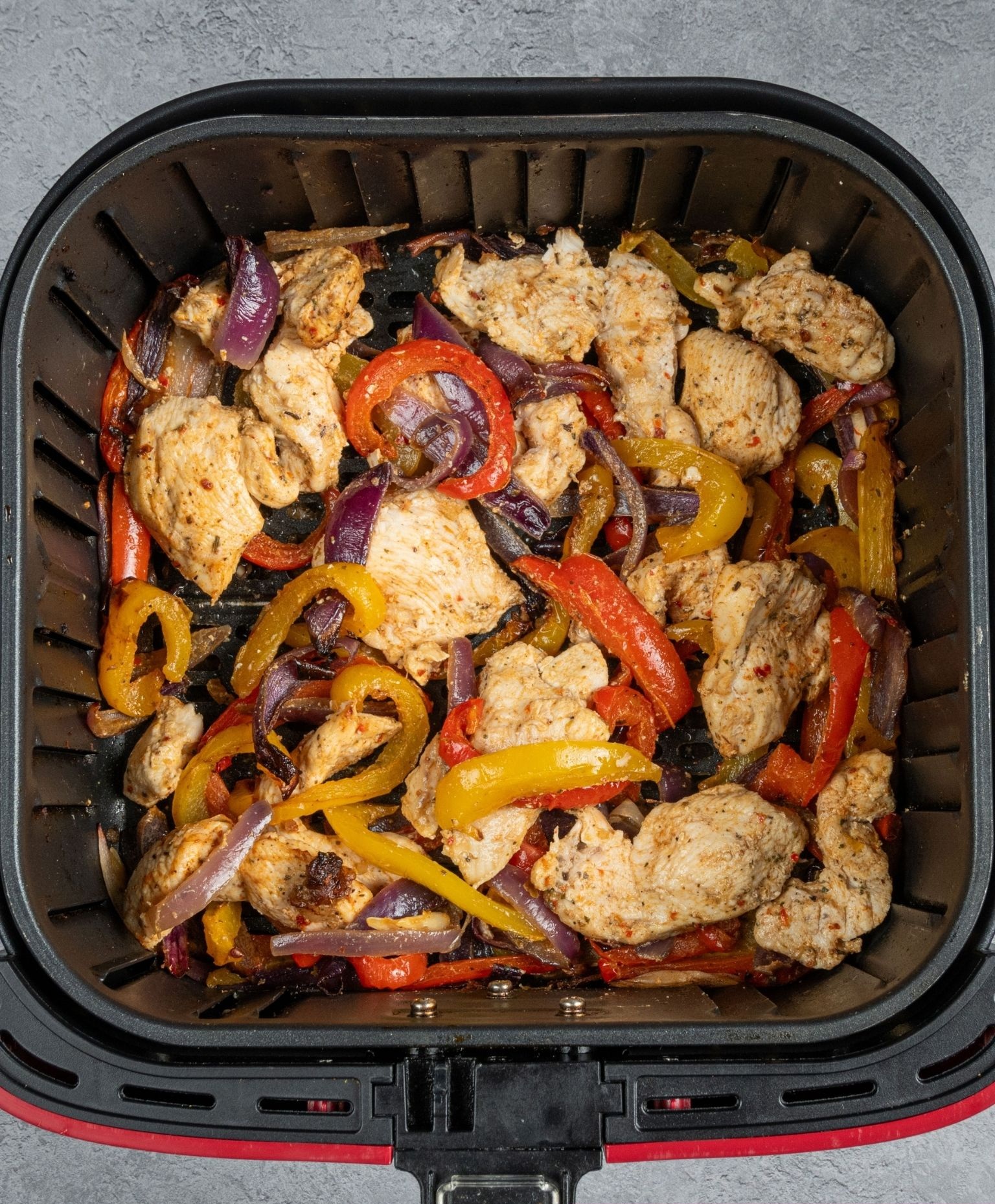 You will love air fryer chicken fajitas. Sliced chicken, mixed peppers, onions and a delicious mix of seasonings, and its so easy to make ahead.