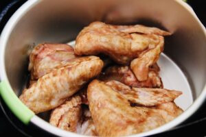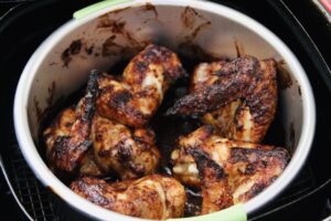 - After an hour place the chicken wings into a cake pan and place in the air fryer.