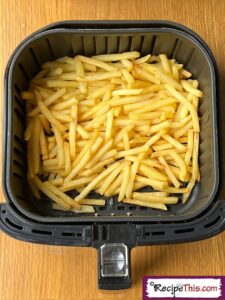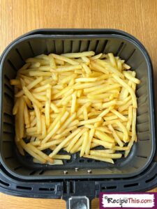 - Place your frozen French fries in your air fryer. Spread them out to stop them being overcrowded as you don’t want soggy fries.