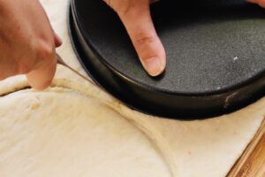 - Using a knife cut out your pizza pan shape and add your pizza dough to each of the pans.