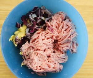 - Peel and thinly dice the red onion. Place all the ingredients into a mixing bowl and mix well until the pork mince is well seasoned.