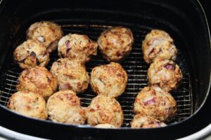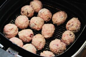 - Place the pork meatballs into the air fryer and cook for 10 minutes at 180c/360f.