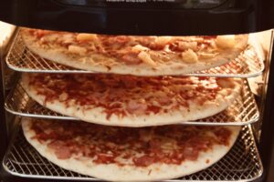 - Place your 9 inch frozen pizzas onto each of the air fryer oven shelves. You can cook one pizza, two or three at once. Set the temperature to 180c/360f and cook for 5 minutes.
