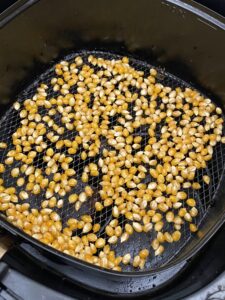 - Add your corn to the air fryer basket and create a big layer that is spread out. You don’t want some corn to pop and others to be stuck together.