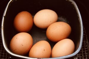 - Place your small eggs into your air fryer baking pan inside of your air fryer basket. Cook for 19 minutes at 120c/250f. Peel your eggs once they are cool enough to handle.
