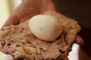 - Place the eggs one at a time onto the rolled-out sausage meat and seal each egg in the sausage meat.