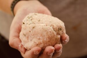 - Season the breadcrumbs with ¼ of your sage and some salt and pepper. Place into a bowl everything else as well as the last of the sage and some extra salt and pepper. Mix well. Season your hands with oat flour and using your hands roll out the sausage meat.