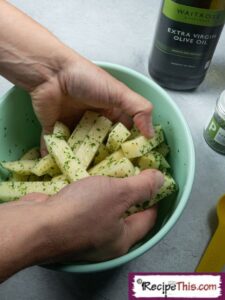 - Start by peeling and chopping the potatoes into chunky chips. Add them to a bowl with your olive oil, parsley and a generous seasoning of salt and pepper.