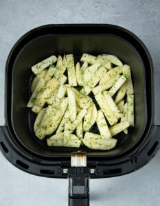 - Place the chips into the air fryer basket, spreading them out for an even cook. Then air fry the chips for 12 minutes at 180c/360f or until fork tender.