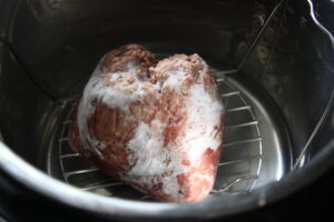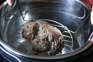 - Place 240ml/1 cup of water into the bottom of the Pressure Cooker. Place the trivet/steamer shelf on top and rest the beef onto the shelf.