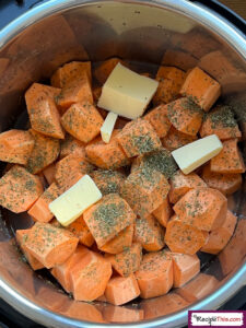 - Place 2.5 cups (600ml) of veggie stock into your inner pot. Add your peeled and diced sweet potatoes and mix with your hands. Add to the top of the sweet potatoes half of the butter, cut into cubes along with the seasonings.