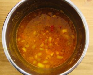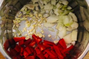- Peel and thinly slice your onion and garlic. Deseed and medium slice your red pepper. Place the onion, garlic and red onion into the Instant Pot with the extra virgin olive oil and cook on sauté for approximately 3 minutes or until the onion is soft and tender.