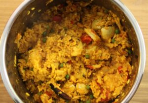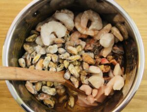 - Add in the rice, chicken, seafood, peas and stir one last time.